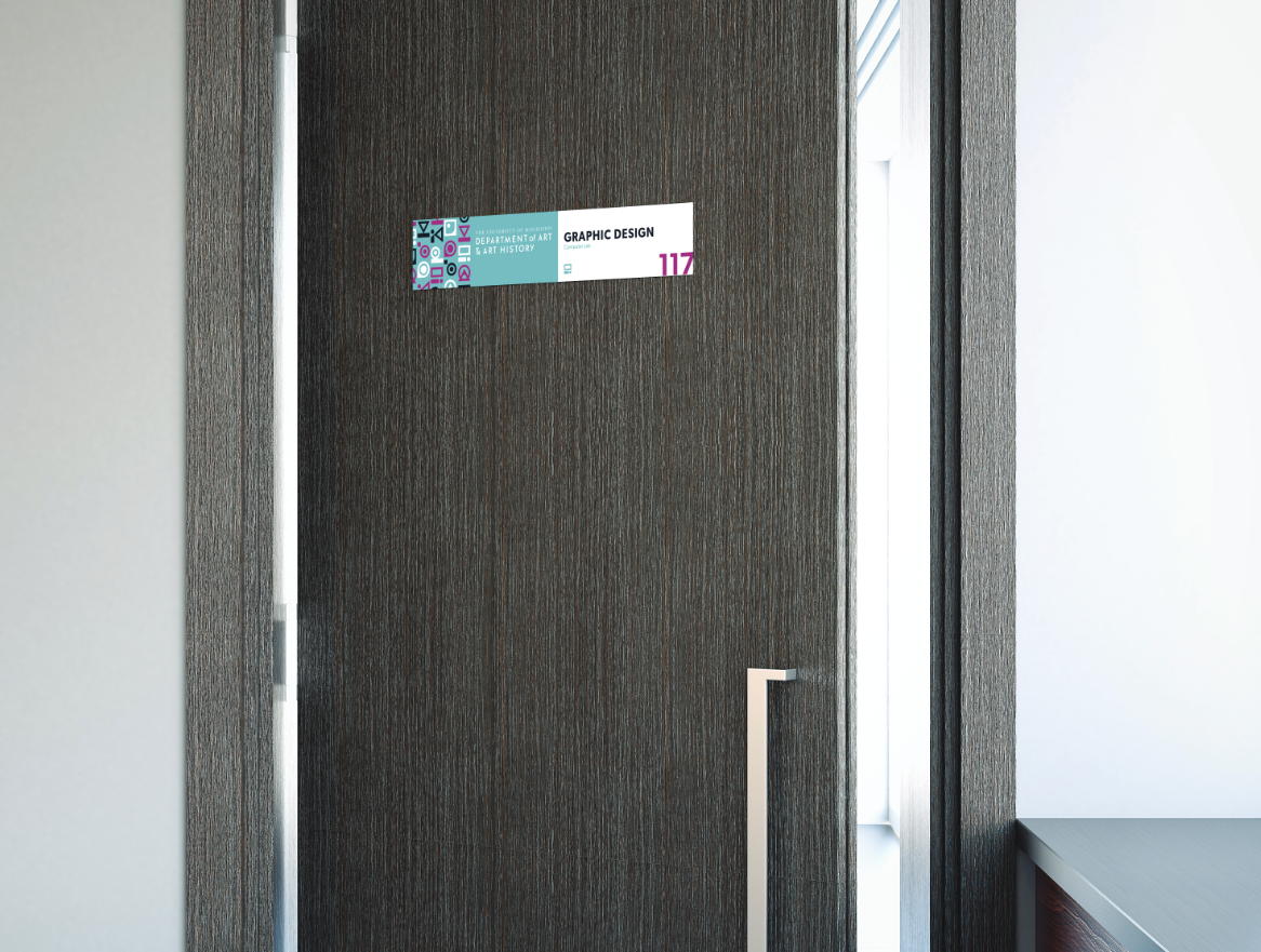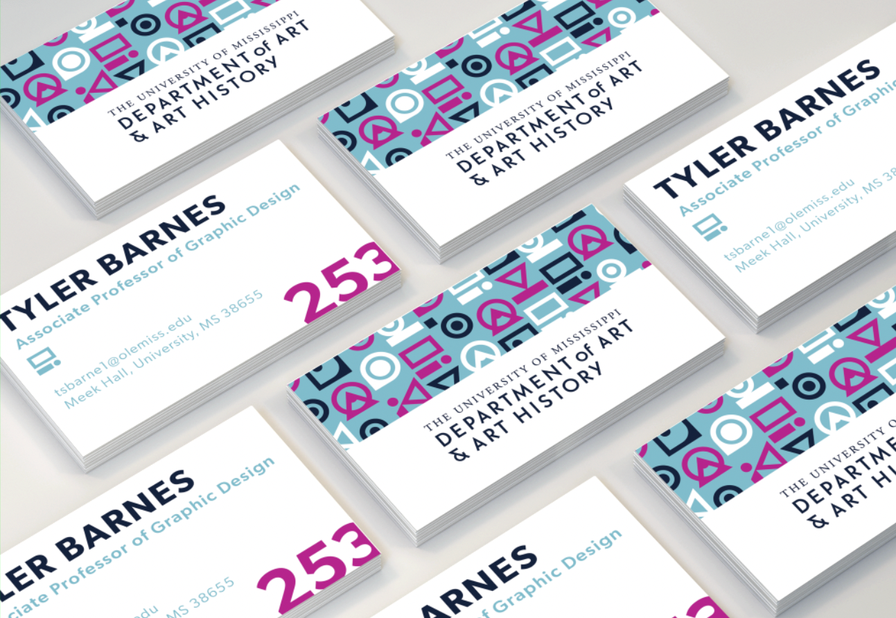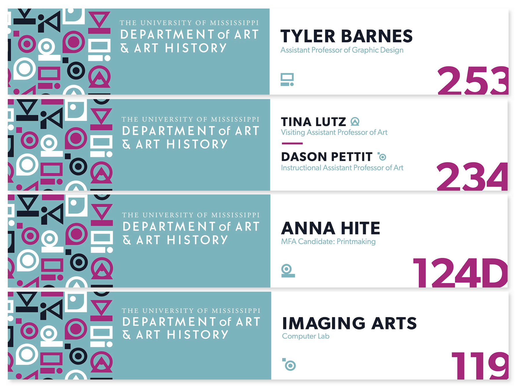 During my internship for the Art Department at the University of Mississippi, I had the opportunity to create new door tags and business cards for Meek Hall (Art School). Featuring a custom pattern made from the Meek Hall icons and color palette.